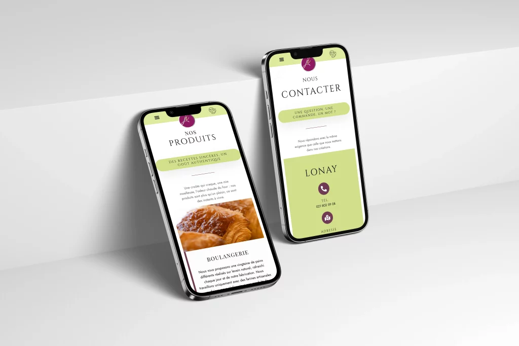 Le site raconte sans bavardage : chaque page répond à une intention. Les gammes présentent l’essentiel (levain naturel, farines locales, créations de saison) et invitent à passer au magasin ; les sections pratiques condensent l’utile (téléphone, mails, horaires, itinéraires). Les micro-copies parlent comme l’équipe au comptoir, avec un ton convivial et concret.
